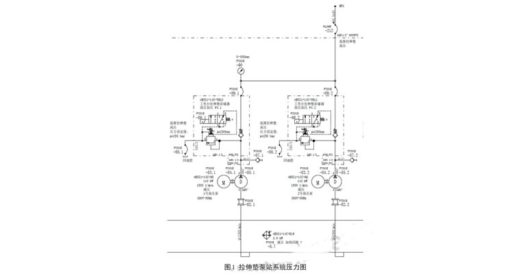 拉伸垫泵站由控制油泵、高压油泵、低压油泵、循环冷却泵组成。实际工作中,除开其它原因导致的泵启动条件不满足的情况外,系统压力故障主要有两种情况,液压泵损坏和泵出口控制阀损坏。液压泵或电机损坏直接导致系统无压力,这种故障查找也非常简单:启动液压泵检查电机和泵的运行状态,如果运行正常,泵体和进出油管温度与油箱温度接近,说明泵没有问题;如泵不能启动,即可排查电机控制电路的熔断器,如熔断器正常,即可检查电机绕组;若出现液压泵能够启动但超负载的现象,需要拆分电机和泵的连接,分别盘车,排查故障是电机还是泵的原因造成。液压拉伸垫泵站采用先导式溢流阀、换向阀和单向阀的组合,实现系统供油和泵无压循环功能,如图 1 所示:拉伸垫动作时系统压力开关监控到压力降低至最小工作压力,就会给出指令到控制溢流阀的换向阀;换向阀得电断开先导阀回油,溢流阀停止无压循环开始往系统供油;当系统压力达到最大工作压力后换向阀失电,系统开启无压循环,单向阀阻止系统油液回流。由于从供油至无压循环交替的过程中,单向阀也会随开启关闭动作,插装式单向阀关闭时如果进出口压差过大,阀芯关闭就会冲击阀体,可能导致阀体碎裂,泵出口油路与回油管直通。若拉伸垫设备在投入使用初期,可能会多次出现单向阀损坏使得系统压力不能建立故障,这就需要调低先导式溢流阀的开启压力即可解决这个问题。而溢流阀的压力调整可以根据压力切换时的状态来调整,可先将压力调高至单向阀关闭时到出现严重撞击阀体上限,再略微调低压力,直到单向阀柔和关闭为止。溢流阀压力调整太低则会导致系统达不到最高压力而一直供油,油液一直溢流回油箱的现象。