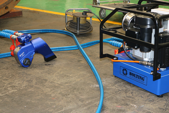 液压扳手是由扳手本体、液压泵站和高压油管组成。启动液压泵站产生压力,将液压油通过油管传送到扳手动力头,推动液压扳手活塞杆前进,由活塞杆带动扳手内部的棘轮,从而带动驱动轴来完成螺栓的预紧和拆松。那么液压泵站选购时有哪些事项呢?